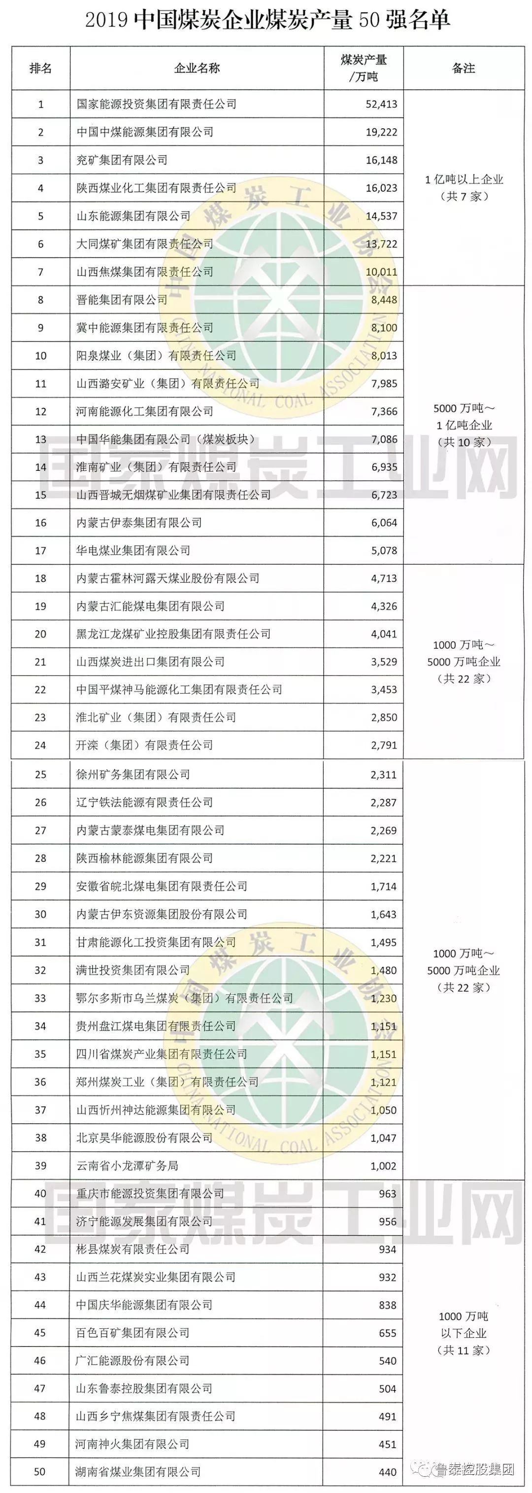 日前,中国煤炭工业协会发布了2019中国煤炭产量50强榜单,鲁泰控股集团以年产量504万吨位居第47位。这是集团公司继上榜2018中国煤炭产量50强榜单后,排名上升三位,再次上榜中国煤炭产量50强。